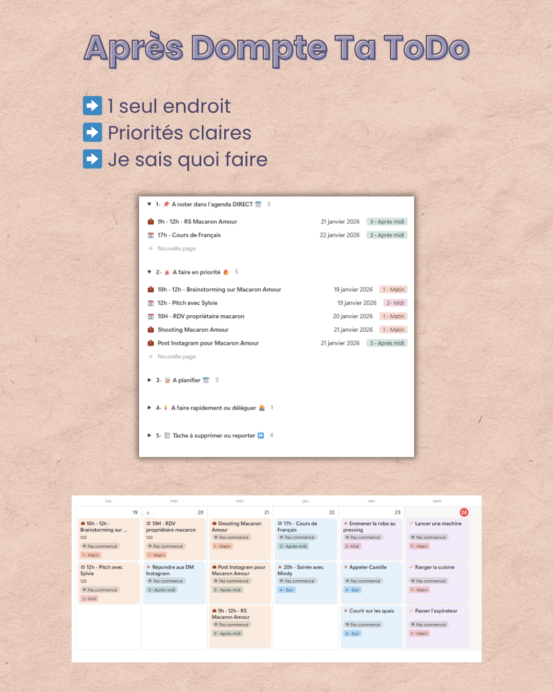 télécharger l'espace Notion et suivre l'atelier pour appliquer le système Dompte ta To-Do™